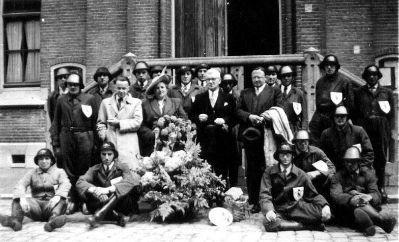 Vorige afbeeldingVolgende afbeelding Huisseling.nl; Brabdweerkorps Ravenstein Het Ravensteinse brandweerkorps met in het midden het echtpaar Elemans-Van den Hoogen. (Bron: Fam. Elemans-van Eeden)